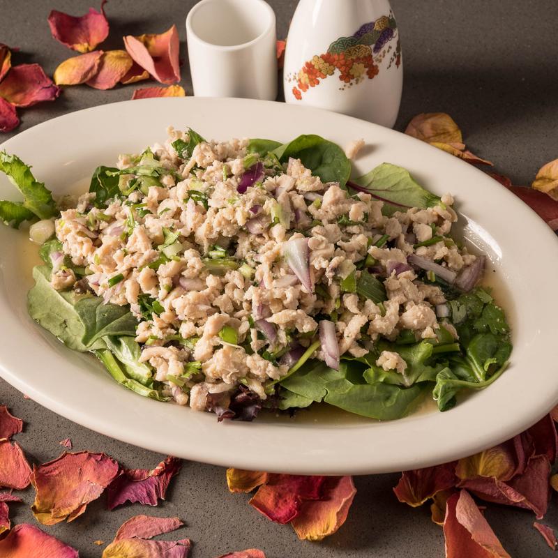Ground chicken or pork with chili lime sauce, onion, green onion, cilantro, roasted rice over lettuce.