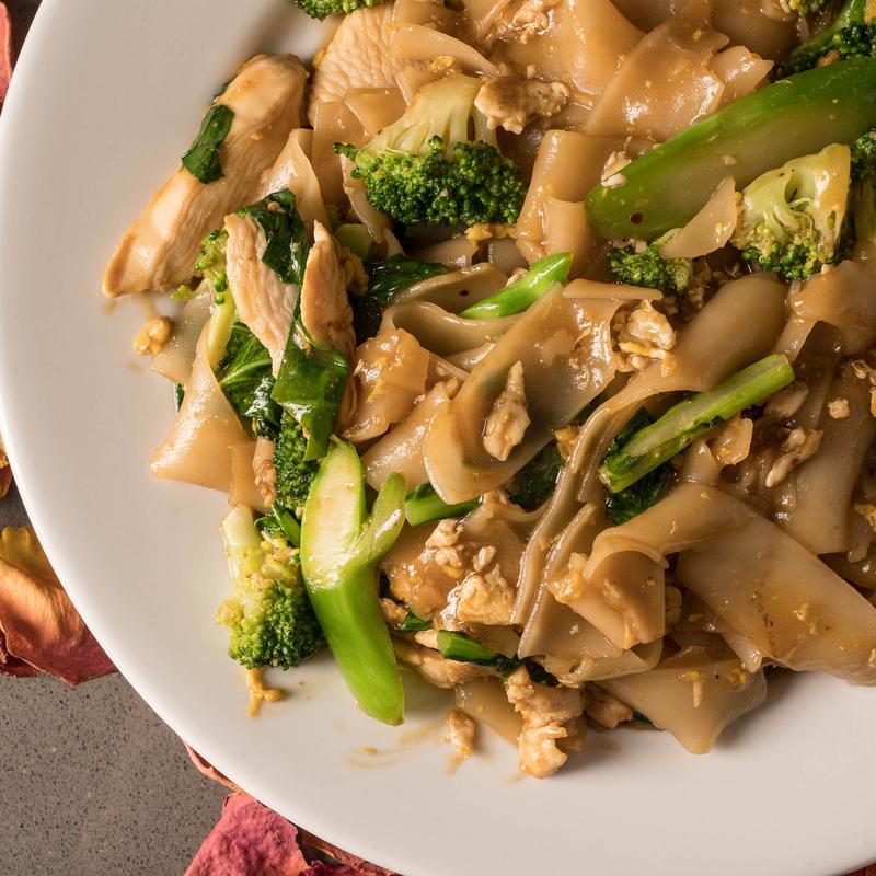 Wide rice noodles withe gg, Chinese broccoli, and broccoli.
