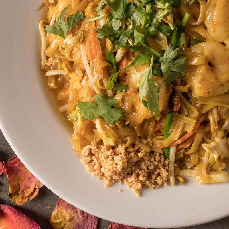 Rice noodles with egg, green onion, carrot, cabbage, & bean sprouts.